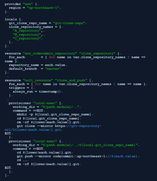 Terraform 으로 도쿄 리전에 codecommit repository를 구성하고, git clone 과 git push를 수행하도록 했습니다.