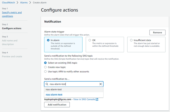 본 TEST에서는 이미 생성한 nau-alarm-test라는 SNS topic으로 In alarm state인 경우 메일을 송신하도록 설정하였습니다.