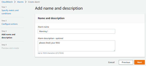 4) Alarm 이름과 description 을 설정합니다.