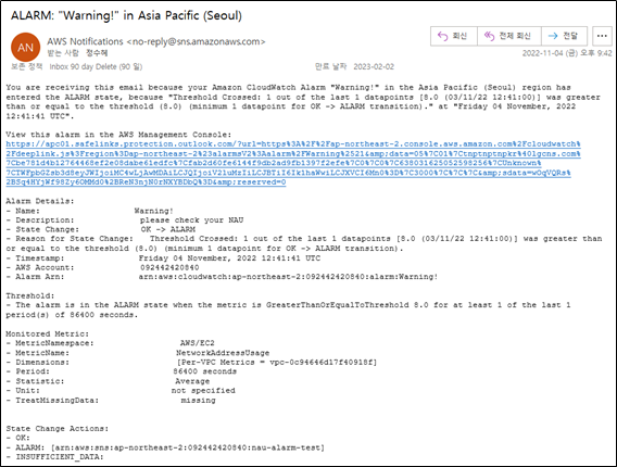 앞서 설정한 NAU 임계치를 넘는 경우, 아래와 같이 CloudWatch Alarm의 State 가 In alarm으로 변경되고, Alarm 생성 시 설정한 SNS의 메일 주소로 상세 내역이 수신됩니다.
