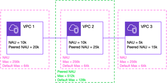 Peering 된 네트워크 주소 사용량 : VPC와 peering 된 모든 VPC에서 보유할 있는 최대 NAU 단위 수의 합계를 의미하며, 상이한 Region에서 peering 되는 VPC는 이 제한에 포함되지 않습니다. 각 VPC는 기본적으로 최대 64,000 NAU 단위를 가질 수 있으며, 이 할당량을 256,000으로 늘리도록 요청할 수 있습니다. VPC가 동일한 Region의 다른 VPC 와 peering 되는 경우 결합된 두 VPC는 기본적으로 최대 128,000 NAU 단위를 가질 수 있고 이 할당량을 512,000으로 늘리도록 요청할 수 있습니다.