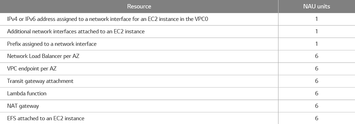 NAU(네트워크 주소 사용량)는 VPC의 크기를 계획하고 모니터링하는 데 도움이 되도록 가상 네트워크의 자원에 적용되는 Metric으로, 관리형 접두사 목록의 IP 주소 및 네트워크 인터페이스와 CIDR로 구성됩니다. 네트워크 주소 사용량 : 단일 VPC에서 보유할 수 있는 최대 NAU 단위 수를 의미합니다.