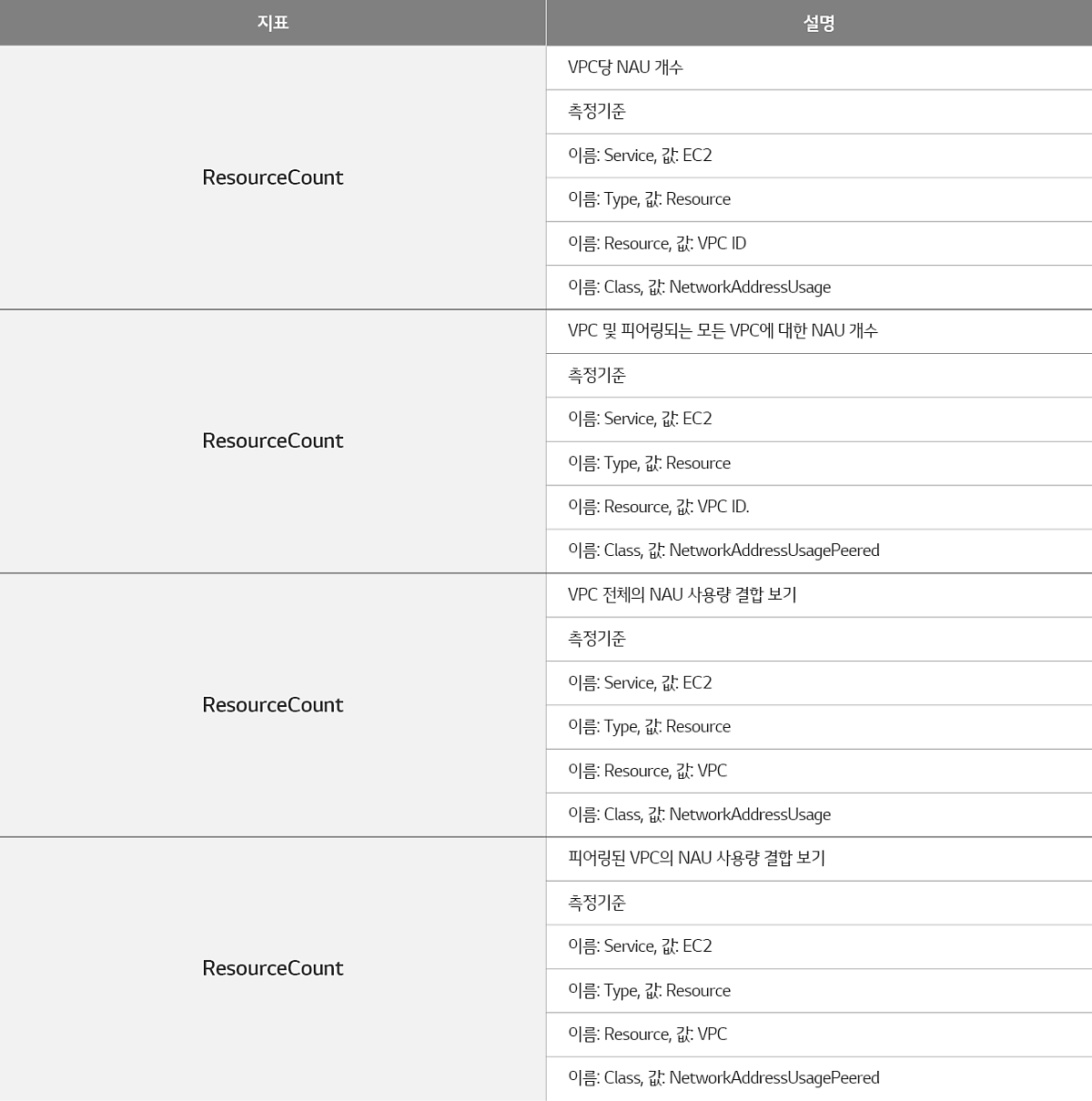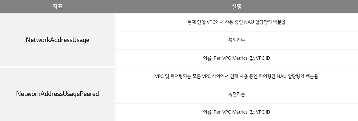 이에 따라 최근 AWS에서 VPC 네트워크 주소 사용량(NAU: Network Address Usage)에 대한 CloudWatch Metric 을 추가하여,