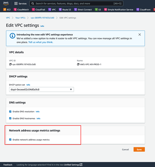 ● NAU 지표는 기본적으로 AWS VPC에서 비활성화되어 있으며, 네트워크 주소 사용량을 모니터링하려는 VPC 단위로 개별적으로 활성화하는 작업이 필요합니다. (VPC > Edit VPC Settings)
