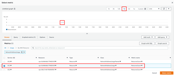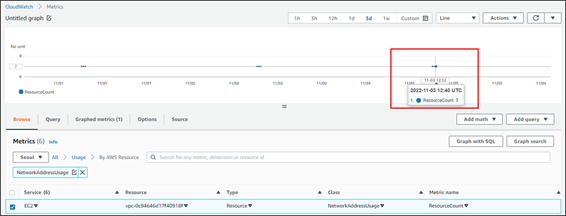 수집 주기가 24시간이므로, 1d 이상 선택해야 현재 수집된 수치가 graph에 표시됩니다. 본 TEST에서는 앞서 NAU 수치를 7로 확인했던 VPC의 NetworkAddressUsage > ResourceCount를 선택하겠습니다.