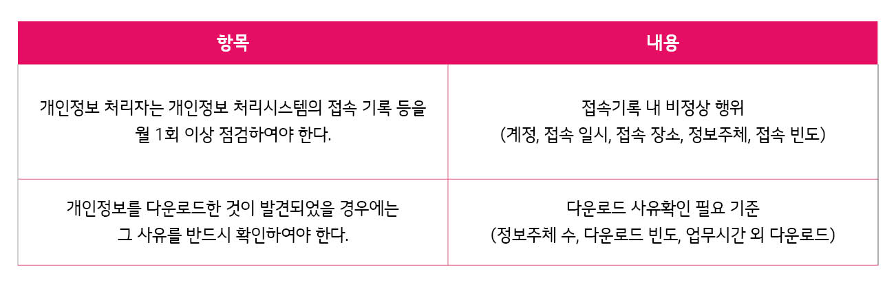 또한 ‘개인정보의 안정성 확보 조치 기준 해설서’의 제8조(접속기록의 보관 및 점검)에는 ‘개인정보처리자는 개인정보의 오‧남용, 분실‧도난‧유출‧위조‧변조 또는 훼손 등에 대응하기 위하여 개인정보 처리시스템의 접속기록 등을 월 1회 이상 점검하여야 한다. 특히 개인정보를 다운로드한 것이 발견되었을 경우에는 내부 관리 계획으로 정하는 바에 따라 그 사유를 반드시 확인하여야 한다.’고 명시되어 있습니다.