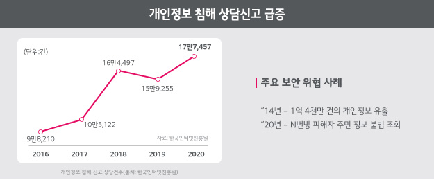 2021년 과학기술정보통신부의 정보보호 실태조사에 따르면, 개인정보 침해 상담 신고는 2016년 10만여 건에서 2021년 21만여 건으로 매년 증가하고 있습니다. 피해자들은 개인정보 유출로 인해 사생활 침해와 피싱, 스미싱 같은 사기성 범죄에 노출되는 등 심각한 피해를 경험하는 것으로 확인됐습니다.