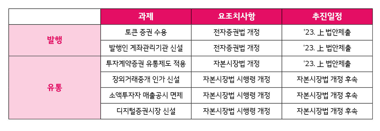 금융당국은 블록체인 기술을 통한 분산 원장 발행을 증권 발행의 한 방법으로 인정하고, ‘발행인 계좌관리기관’을 신설한다는 내용을 개정 전자 증권법에 담기로 했습니다. 발행인 계좌관리기관은 은행이나 증권사가 아니라도 일정 요건을 갖춘 사업자가 직접 토큰증권을 등록/관리할 수 있도록 허용되는 라이선스입니다. 그리고 자본시장법 개정안에 토큰증권을 유통하는 ‘장외거래 중개업’ 신설에 관한 내용도 포함했습니다. 이후 장외거래 중개 인가 신설, 소액투자자 매출 공시 면제, 디지털 증권시장 신설 등을 후속으로 담기로 했습니다.