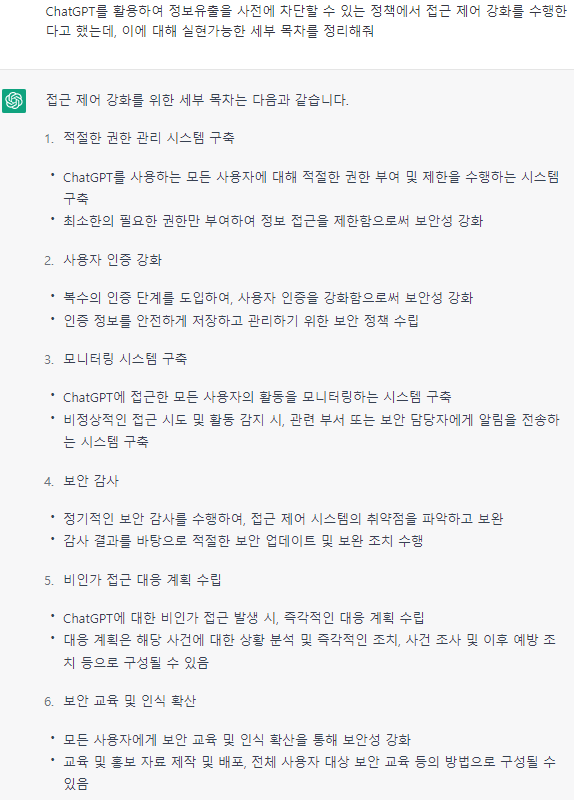 챗GPT는 벨 라파둘라(Bell-LaPadula, 보안 레벨을 기반으로 엄격한 보안 정책을 중앙 집중식으로 관리) 접근통제모델과 달리, 권한에 따라 접근을 통제하는 상세 정책을 제시하지는 않습니다. 그러나 접근제어 시스템을 도입하거나 개발하는데 어떤 요소가 필요한지는 손쉽게 확인할 수 있습니다.