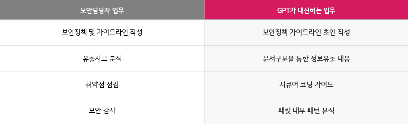 보안 업무에서 챗GPT를 활용할 수 있는 항목은 다음과 같습니다.