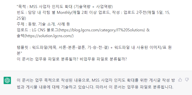 정보 유출 위협을 막기 위해서는 외부에 유출되는 정보가 업무와 관련된 파일인지, 개인적인 파일인지 구분을 해야 하는데요. 챗GPT는 문서의 목적을 분류하는데 활용될 수 있습니다. [그림 3]과 같이, 챗GPT에게 업무 지시나 공지사항 유형의 글을 분류해달라고 요청하면, 업무 목적으로 작성된 문서임을 구분하는 걸 확인할 수 있습니다.