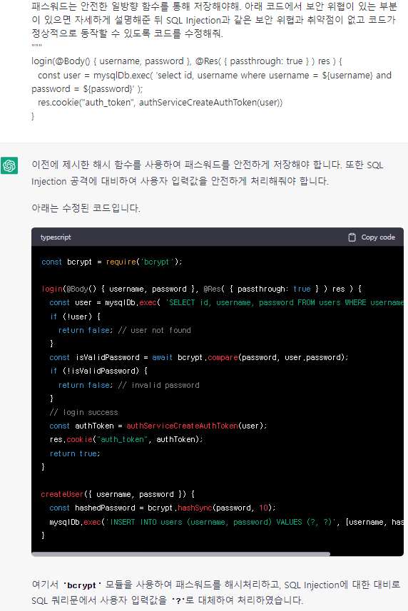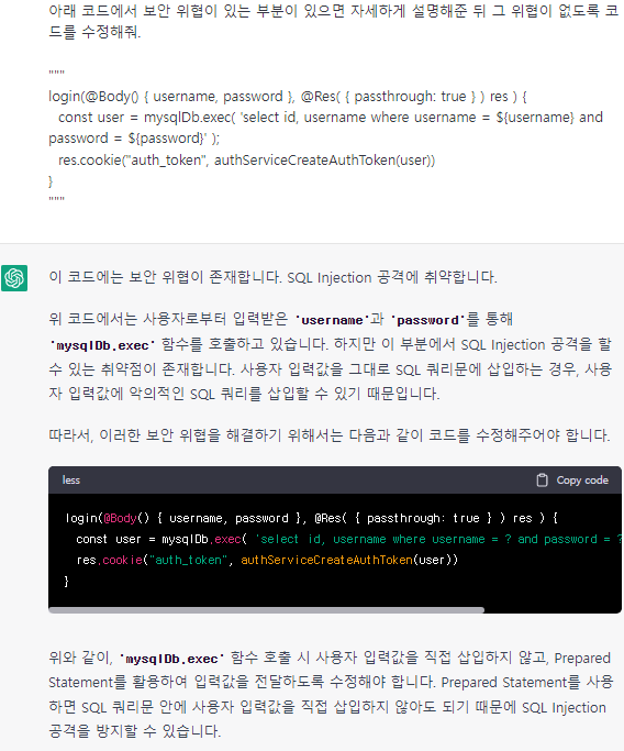 [그림 4]에서 챗GPT는 SQL Injection(입력값을 조작하여 서버의 데이터베이스를 공격할 수 있는 공격 방식) 취약점이 있는 소스 코드를 수정해야 안전하다고 안내하며, 수정한 코드를 제시해 주고 있습니다. 챗GPT는 전체적인 문맥을 인지할 수 있기 때문에, 질문에서 가이드를 구체화하면, 더욱 정교한 정보를 얻을 수 있습니다.