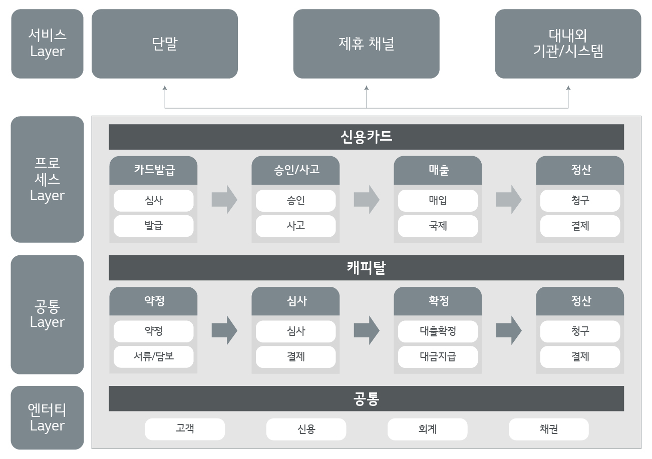 카드/캐피탈 응용 아키텍처는 업무 시나리오를 처리해 주는 프로세스 컴포넌트, 업무 핵심 기능을 처리하는 공통 컴포넌트, DBMS와 연동해 데이터 처리해 주는 엔터티(Entity) 컴포넌트로 구성돼 있습니다. 업무 컴포넌트 간 역할을 명확히 분리해 독립성을 높이고 업무 변경에 유연하게 대처할 수 있습니다.