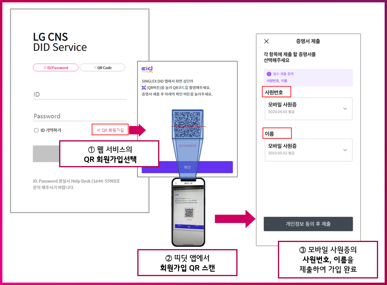 사내 식당, 복합기 등 다양한 서비스 사용을 위해 임직원 정보를 등록하는 경우, 비교 검증을 위해 전체 인사 DB를 동기화할 필요가 없습니다. [그림 5]와 같이 QR 스캔을 통해 모바일 사원증(인증서)을 제출하고, 사용자를 등록하면 서비스를 이용할 수 있습니다. 이는 네이버나 카카오 인증과 같은 제3자 인증을 통해 온라인 쇼핑몰에 가입하는 것과 유사한데요. 띠딧은 제3자에 의존하지 않고 모바일 내 저장된 인증서를 자체적으로 관리한다는 차이가 있습니다.