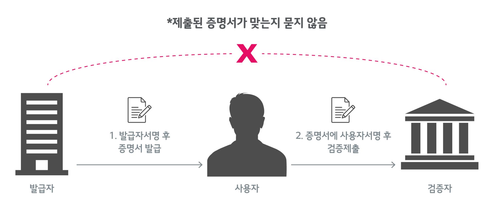 3) 검증기관은 사용자가 제출한 증명서만 신뢰합니다. 모바일 사원증은 인증서 양식(schema)과 발행정보를 블록체인에 저장하고, 고유의 키로 서명해 발급합니다. 누군가가 인증서를 변조하거나 복사해서 사용할 수 없는 거죠. 검증자는 사용자가 인증서를 제출했을 때, 발급기관에 따로 묻지 않고 서명을 풀어 검증하는 것만으로도 내용을 신뢰할 수 있습니다.
