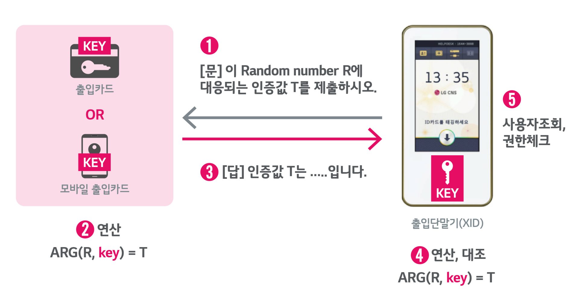 띠딧은 암호화를 통해 안전한 출입통제 서비스를 제공합니다. 사용자가 모바일 사원증을 출입 단말기에 태깅할 때마다 랜덤한 숫자 값이 생성되는데요. 출입 단말이 상호 공인된 알고리즘을 통해 암호화한 값을 문제로 제시하면, 모바일 사원증은 인증값을 제공해야 합니다. 출입을 시도하는 카드가 정당한 카드가 맞는지 확인한 후, 사용자의 출입 권한을 체크하는 과정입니다. 태깅되는 값이 중간에 노출되거나 암복호화(의미를 알 수 없는 데이터를 해석해 의미를 알 수 있는 정보로 변환) 알고리즘이 공개돼도, 모바일 내 암호화된 사원증 증명서로 안전하게 사용할 수 있는 것이죠.
