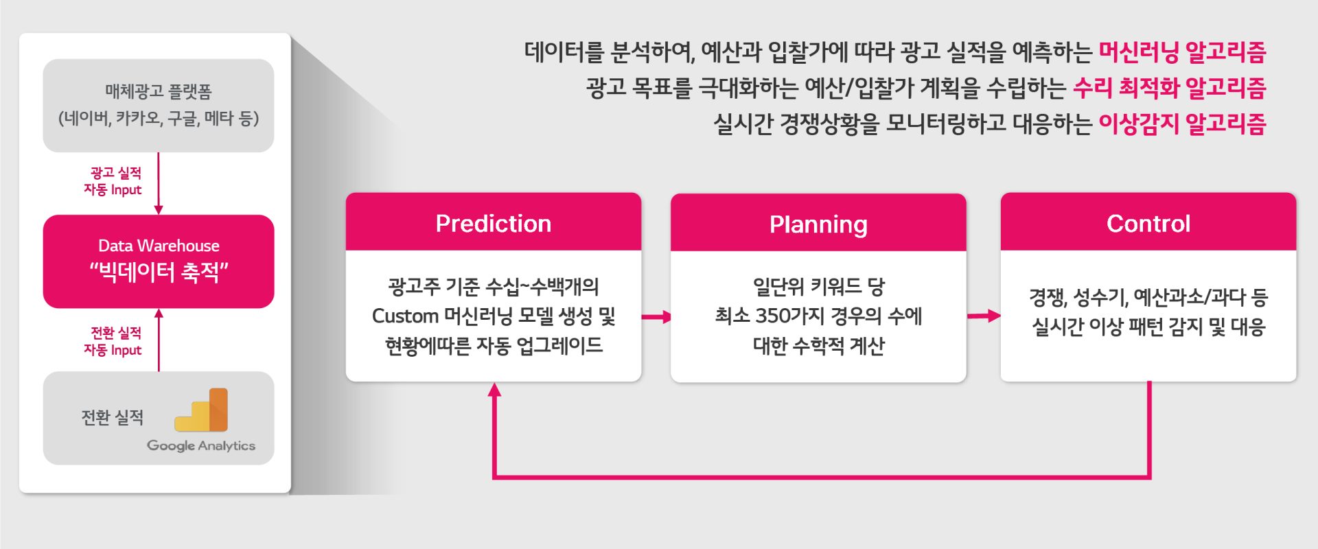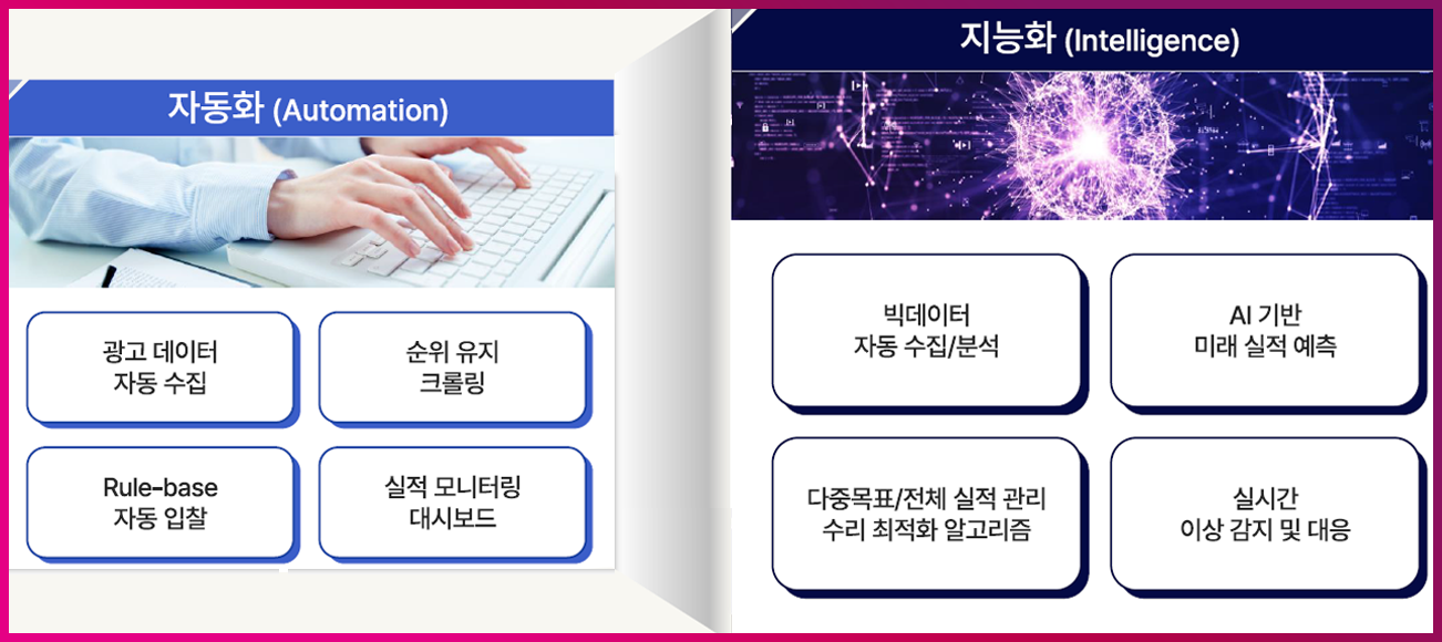 2) 계획(Planning): 수학적 최적화 기술로 AI가 도출한 다양한 예측 모델을 사용해 최적의 광고 운영계획을 도출합니다. 광고 효과가 높은 노출 위치, 시간대, 빈도 등을 고려해 광고 예산 분배와 최적 입찰가격까지 도출합니다.