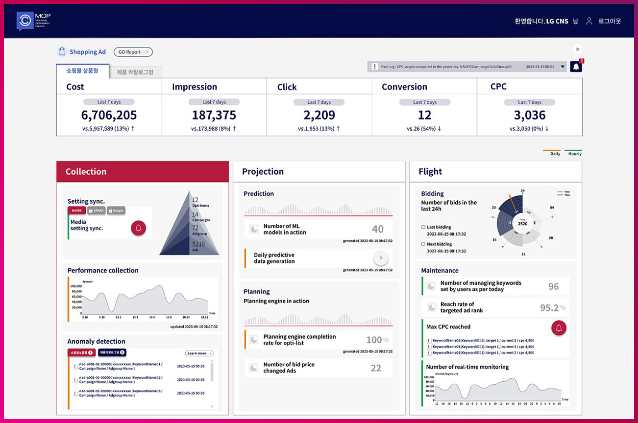 LG CNS는 지난해 11월부터 주요 고객사들을 대상으로 MOP를 제공하고 있습니다. 국내 톱 광고대행사, 미디어랩사들이 MOP를 도입해 검색광고 운영, 광고 최적화에 활용하고 있습니다. A 건강기능 식품기업은 MOP 도입 후 광고비 대비 매출액이 30.1% 향상됐으며, C 제조기업은 검색광고 노출 빈도 수 15.3% 상승, 검색광고 단가 12.9% 절감 등 탁월한 효과를 경험하고 있습니다.