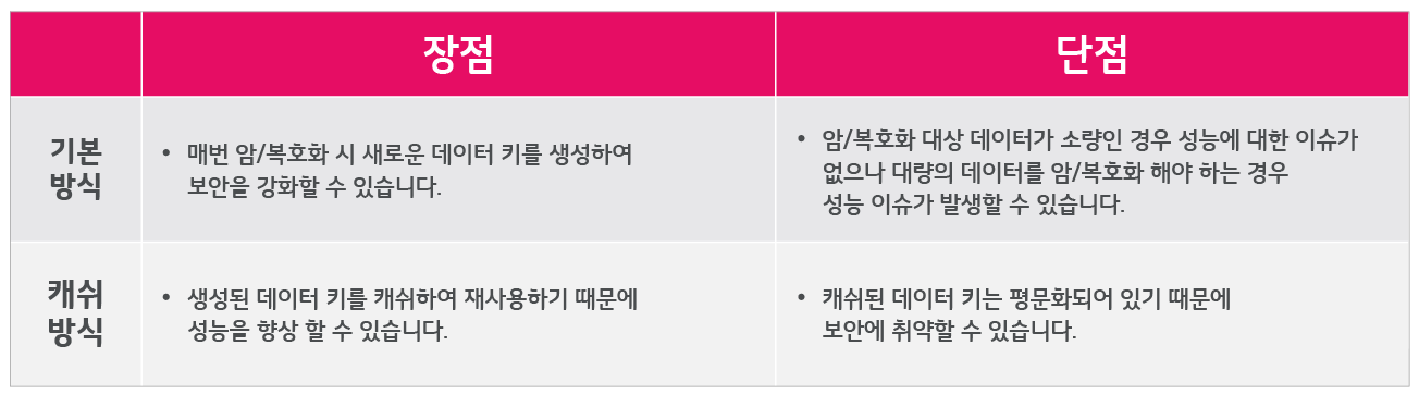 데이터의 암/복호화를 진행할 때, Key 관리는 매우 중요하면서도 어려운 항목인데요. 데이터 키를 관리하는 방식엔 데이터 키를 매번 새롭게 생성하는 기본 방식과 생성된 데이터 키를 특정 조건에서 재사용하는 캐쉬 방식이 있습니다. 보안 강화를 위해서는 이 두 가지 방식을 함께 고려해야 하는데요. 두 가지 방식의 장/단점이 뚜렷하기 때문에 구축해야 할 비즈니스 요건 및 애플리케이션의 특징에 따라 선택해야 합니다.