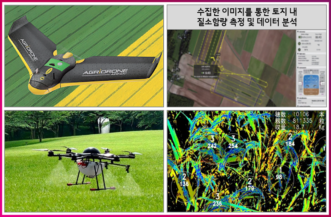 농업용 드론은 촬영용 드론과 농약을 살포하는 방재용 드론, 비료를 살포하는 시비용 드론 등이 있습니다. 무인 드론은 배터리, 비료, 농약을 스스로 충전하는 보조 시스템이 필요하며, 이와 관련된 드론 스테이션 분야가 지속적으로 발전하고 있습니다.