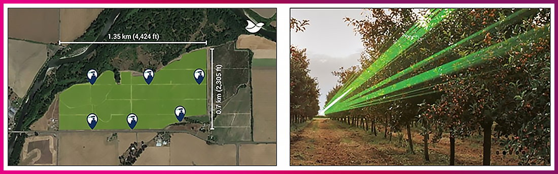 해충 예찰은 농사를 방해하는 해충과 조류를 감시하는 장비가 중심인데요. 디지털 트랩으로 특정 페로몬에 반응하는 해충을 포집하고, 실시간으로 해충의 개체 수를 파악해 일정 수준에 이르면 자동으로 방재합니다. 조류 퇴치기는 특정 조류를 반경 200M 내에서 감시하고 실시간으로 이미지를 분석해, 감지 시 레이저와 초음파로 조류를 쫓아내는 장비입니다.