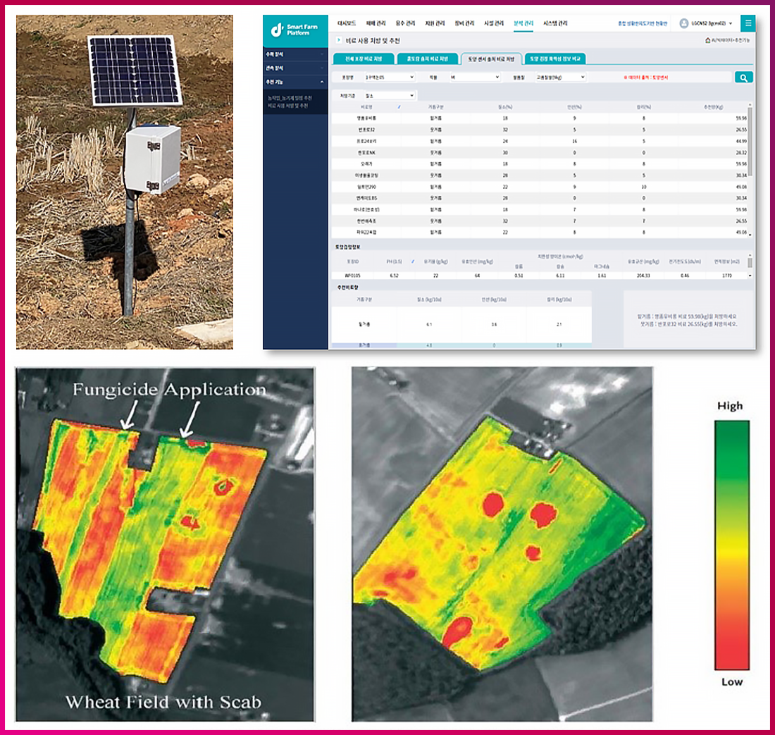 토양정보 활용 고도화 분야에서는 토양 센서로 토양의 온도, 습도, 성분 등의 데이터를 수집해 토양의 상태를 실시간으로 모니터링하는 기술이 활용되고 있는데요. 비료가 필요한 경우 관리자에게 알림이 가며, 해당 지역에서 구매할 수 있는 비료를 추천하는 등 고도화된 서비스를 제공하고 있습니다. 또한 초분광 이미지를 활용해 비료가 환경에 미치는 영향을 분석하고, 비료를 자동 처방해 토양의 화학성 변화를 감시하기도 합니다.