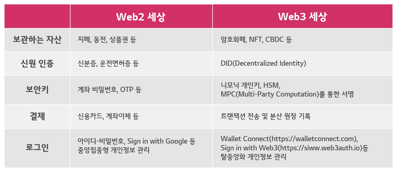 여기서 디지털 자산은 Coin(Native token), FT(Fungible token), NFT를 포함한 모든 자산을 일컫는데요. 보관하는 자산의 유형은 다를 수 있지만, 결국 자산을 보관하고 사용한다는 관점에서 기존 Web2 세상의 지갑과 크게 다르지 않습니다.