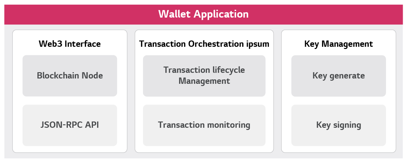 블록체인 노드는 보편적으로 JSON-RPC API(JSON encoded Remote Procedure Call, JOSN 형식으로 된 통신 규약)를 지원합니다. Web3 Interface는 노드의 JSON-RPC API를 통해 계좌의 잔액을 확인하거나, 디지털 자산을 전송하고, 원장의 데이터를 파악합니다. 초기의 Web3 지갑은 단일 블록체인 네트워크만 지원했는데요. 최근에는 멀티 체인을 지원하는 지갑이 늘어나는 추세입니다. LG CNS의 Web3 지갑 서비스 또한 EVM(Ethereum Virtual Machine, 스마트 컨트랙트를 처리(배포, 실행) 하기 위한 이더리움 가상 머신) 기반 체인, Solana(탈중앙화 분산 방식의 블록체인 시스템이 빠른 속도와 높은 성능을 구현하는 것을 목표로 하는 블록체인 플랫폼), Hyperledger Fabric(블록체인 솔루션과 응용 프로그램 개발하기 위한 모듈형 아키텍처 플랫폼) 등의 멀티 체인 서비스를 제공하고 있습니다.