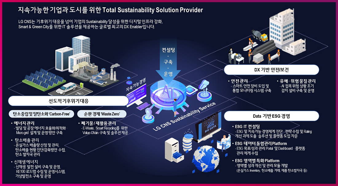 LG CNS는 기업과 도시의 지속 가능한 미래와 성장을 위한 디지털 성장 조력자(Digital Growth Enabler)로서, ESG 경영을 위한 데이터 기반의 종합 플랫폼을 운영하고 있습니다. 고객의 ESG 경영 내재화 및 고도화를 위한 진단, 전략 및 체계 수립, 장단기 과제 도출, 플랫폼/솔루션 도입을 위한 컨설팅과, ESG포털에서부터 ESG 성과 관리 시스템(ESG Performance Management System)에 이르는 서비스를 제공합니다.