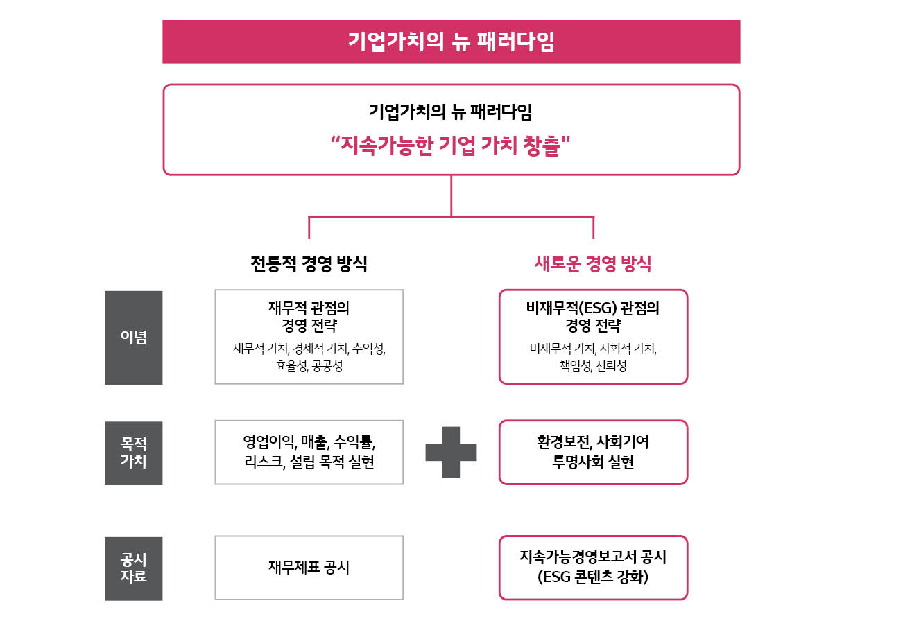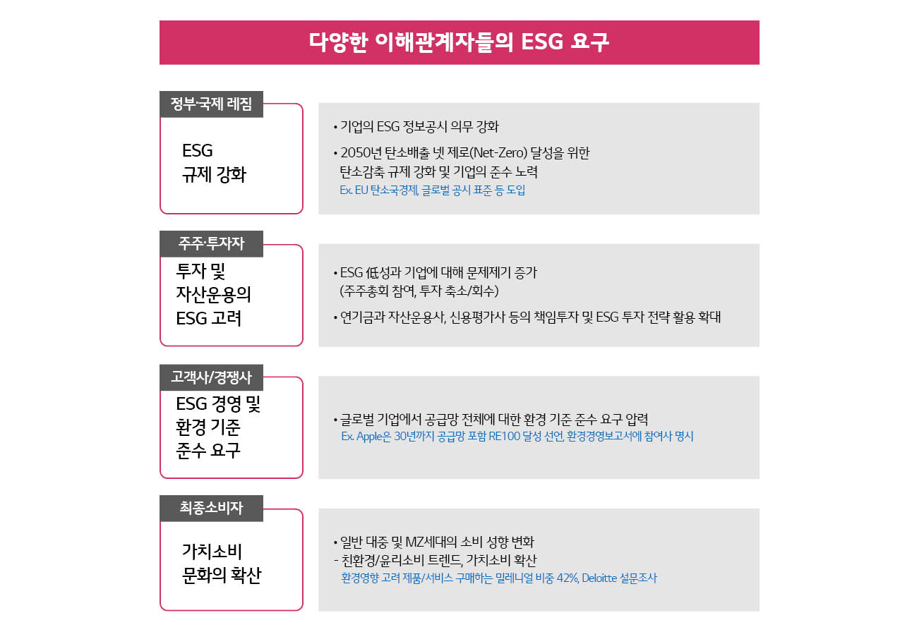 ESG는 주주와 투자자 관점에서 기업의 지속 가능성을 판단하는 기준이 되고 있는데요. 이에 연기금과 자산운용사, 신용평가사 등의 책임 투자 및 ESG 투자 전략 활용이 확대되고 있습니다. 고객 관점에서도 ESG가 공급망 관리와 협력업체 선정의 주요 요소로 부각되고 있으며, 특히 MZ 세대 고객의 요구가 증가하는 추세입니다.