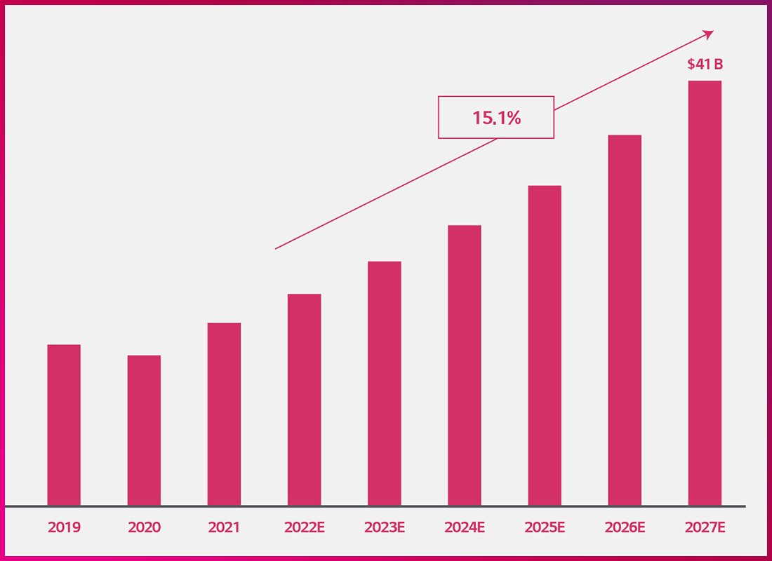 자동화를 가속화하는 또 하나의 요인은 물류산업에서 운송비를 제외하고 가장 많은 비용을 차지하는 인건비입니다. 전 세계적인 인플레이션은 인건비 상승을 부추기며 이에 대응하기 위한 수단으로 적극적으로 자동화 설비를 도입하는 업체도 증가하는 추세입니다. 아래 [그림 1]은 증가하는 자동화 설비 시장 규모를 나타냅니다.