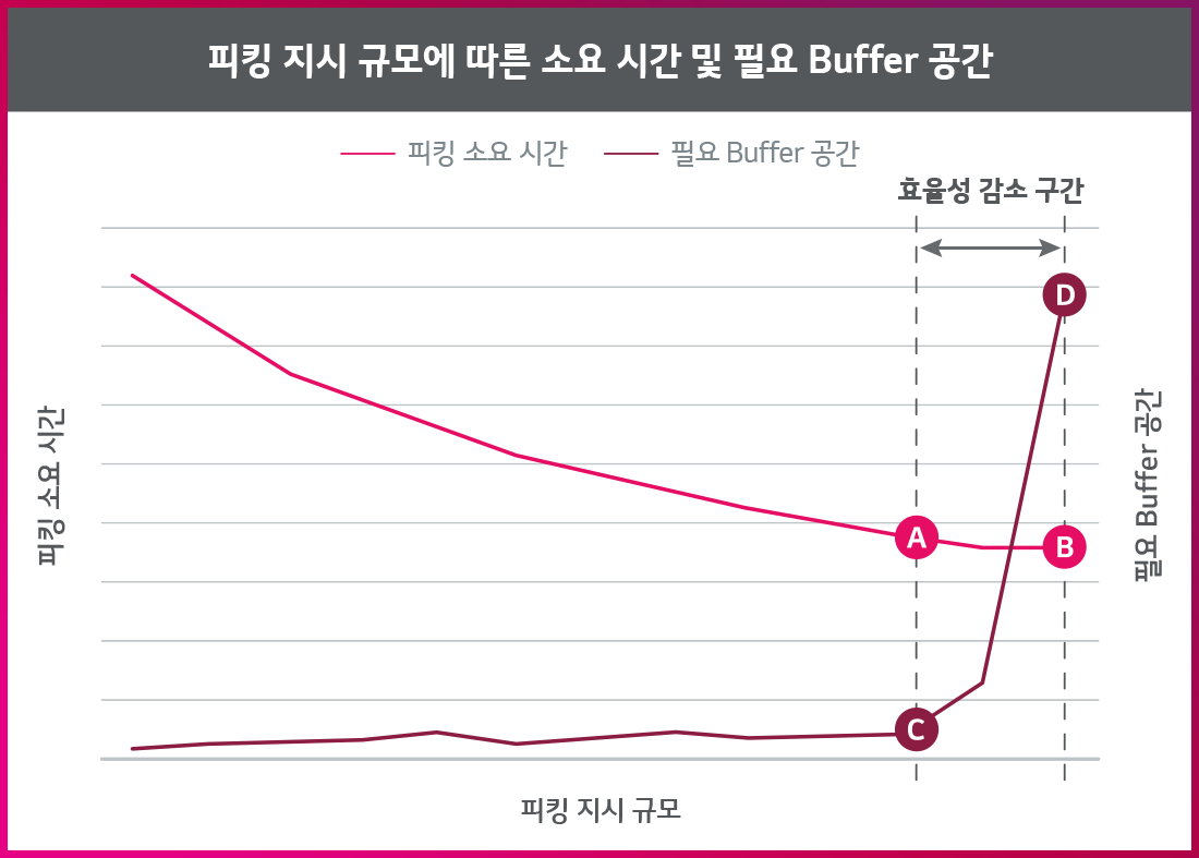 [그림 2]에서 X축은 피킹 지시 규모를 나타내며, 피킹 지시 규모를 늘릴수록 전체 소요 시간은 줄어들고 필요한 Buffer 공간은 늘어납니다. 일정 규모를 넘어서게 되면 소요 시간에 더 이상 큰 개선이 일어나지 않는 효율성 감소 구간에 돌입하게 되는데요(A 대비 B는 6% 향상). 이 구간에 돌입하면 피킹 지시 규모를 늘릴수록 후공정 설비의 병목이 심화돼 필요한 Buffer 공간이 기하급수적으로 늘어나게 됩니다(C 대비 D는 2000% 증가).