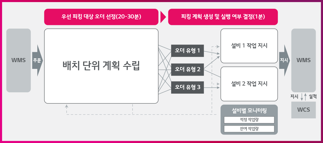 WMS(Warehouse Management System, 창고 관리 시스템)는 출하 예정 오더를 생성하고, WCS(Warehouse Control System, 창고 제어 시스템)는 WMS에서 전달받은 피킹 계획을 수행합니다. 최적화 모듈은 WMS에서의 오더 간 우선순위, 차량 간 우선순위, 차량 별 출하 마감 시간 등의 운영 상 제약을 준수하면서 WCS에서 동작 중인 설비 별, 작업장 별 잔여 투입량, 잔여 작업량 등을 고려해 설비의 생산성 극대화 및 작업장 간 작업 밸런싱을 위한 계획을 수립합니다.