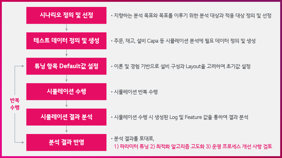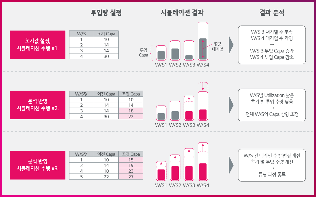 LG CNS는 시뮬레이션 결과를 기반으로 고객이 운영을 원활하게 할 수 있도록 운영 프로세스 개선 검토 사항 및 최적화 옵션 설정 가이드를 제공하고 있습니다.