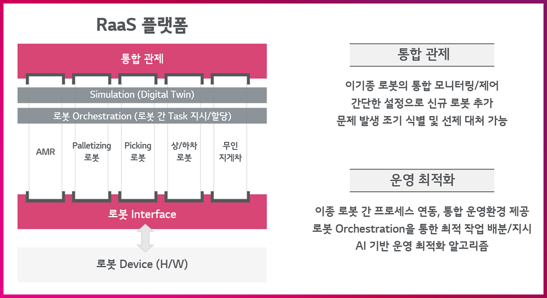 앞으로 물류 시스템에 AI를 대규모로 적용하고 운영하기 위해서 전체 자동화 설비를 통합하고 지능화하기 위한 혁신적인 플랫폼을 활용할 것으로 예상됩니다. 우선 이기종 로봇에 대한 통합관제 등 운영을 최적화하고 초기 투자를 최소화해 구독형으로 서비스하는 로봇구독서비스(RaaS, Robot as a Service) 플랫폼 적용이 확대되고 있습니다.