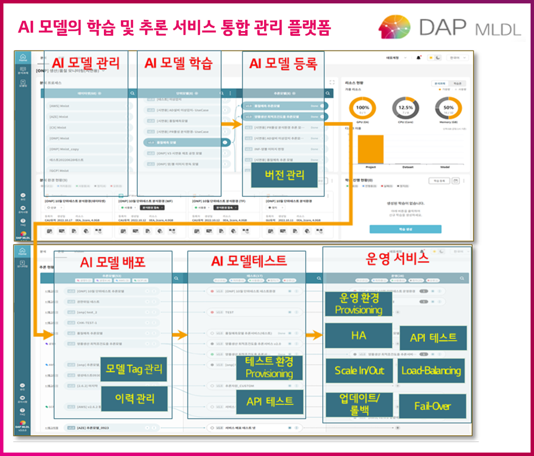 학습 데이터를 축적하고 비전 인식, 예측 분석, 최적화 운영, 개별 설비 및 로봇의 강화 학습 제어 AI 모델을 관리하는 MLOps(Machine Learning Operations) 플랫폼도 함께 검토가 필요합니다. MLOps는 AI 모델의 학습, 추론, 서비스를 통합 관리하는 플랫폼인데요. AI 모델의 생성, 학습, 모델 등록, 배포, 테스트, 운영 서비스가 끊김 없이 연결되는 것이 특징입니다. 운영 데이터를 통해 지속적으로 지능화되어 생산성을 극대화하는 역할을 수행합니다.