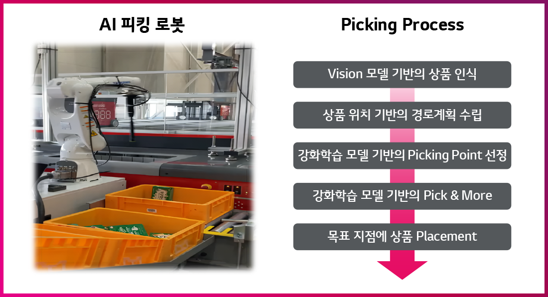 물류 과정에서 사람 손이 많이 가는 작업 중 하나가 상품을 집는 피킹(Picking)인데요. 딥러닝 비전(Vision)과 강화 학습 알고리즘을 활용한 AI 피킹 로봇으로 다양한 형태의 상품을 처리하기 위해 준비하는 시간을 단축할 수 있습니다. 먼저 3D Vision 카메라로 3D 포인트 클라우드 데이터를 생성합니다. △관심 영역 필터 △특징추출 △다운 샘플링 △세분화 등을 거쳐 상품을 인식하고 로봇의 이동 경로 계획을 수립합니다. 로봇-카메라 보정(Robot Camera Calibration)과 강화 학습 모델 기반의 피킹 포인트 선정으로 보다 정확한 피킹을 구현합니다.