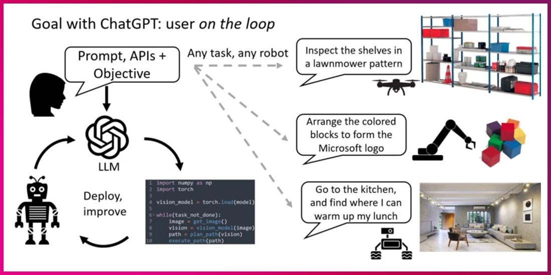여기에 생성형 AI가 적용되면 로봇의 티칭(Teaching)과 제어(Control)도 기존과 같은 프로그래밍이나 물리적인 조작 없이 손쉽게 할 수 있으며, 작업 대상물이나 프로세스의 변화에 유연하게 대응할 수 있게 됩니다. 마이크로소프트 연구팀에 따르면 앞으로는 IT나 로봇 전문가가 아니어도 누구나 자연어로 생성형 AI를 사용해 로봇을 동작하고 제어할 수 있습니다. 즉 생성형 AI가 사용자와 대화하며 다양한 사용 목적에 맞게 코드를 생성하고 로봇을 제어하게 되는 것이죠. 말 그대로 로봇과 대화하며 공장이나 물류센터에서 협업하는 일이 가능해진 것입니다.