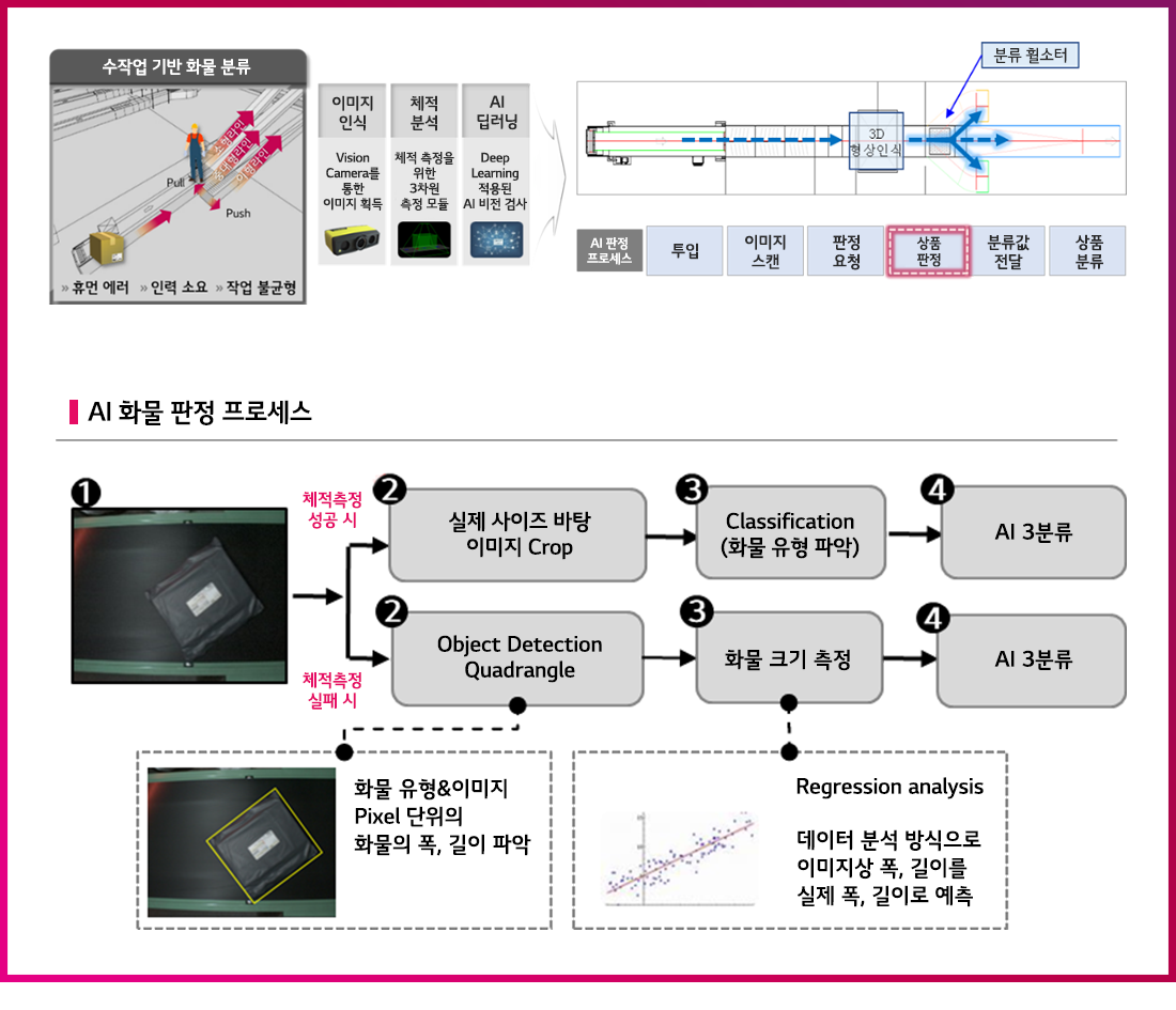 지능형 화물 자동 분류는 AI 딥러닝으로 이미지 크기와 형상을 자동 판정하는 기술입니다. 물류창고 상황에 맞게 분류 기준을 조정하고 현장에서 AI 분류 모델을 학습해 적용합니다. 프로세스는 △카메라를 통해 체적 측정 △실제 사이즈 바탕의 이미지 절단 △화물 유형을 파악해 AI로 분류 등인데요. 이러한 AI 판정 및 분류 기술은 상품 분류 정확도를 향상시키고 운영 인건비를 절감할 수 있어 다양한 산업분야에서 적용될 수 있습니다.