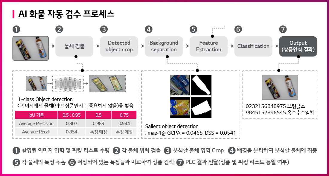 AI 딥러닝으로 수작업에 의존하던 상품 발송 전 검수 프로세스도 자동화할 수 있습니다. 주요 적용 기술은 △물체 검출(Object Detection) △배경 분리(Global Context-Aware Progressive Aggregation Network for Salient Object Detection) △특징 추출 (Combination of Multiple Global Descriptors for Image Retrieval) △상품 검색 및 분류 (Classfication) 등입니다.