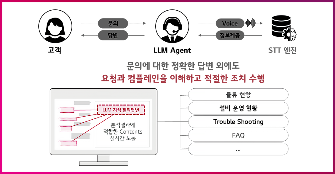 첫 번째로 생성형 AI가 물류센터에서 문제 해결 및 진단 역할을 맡을 수 있습니다. 음성 응대가 가능한 초거대 언어 모델(LLM, Large Language Model) 기반 AI 컨택센터가 그 예입니다. 이미 챗봇 기반 컨택센터는 학습 데이터로 원활한 응대가 가능한 수준인데요. 여기에 LLM 기반의 생성형 AI를 활용해 센터 운영이나 고객 문의에 대한 정확한 답변 외에도 다양한 고객의 요청과 컴플레인을 이해하고 적절한 조치를 수행할 수 있습니다. 또한 운영인력의 숙련도가 상이한 상황에서 비숙련자에 대한 교육 및 업무지원 역할을 AI가 수행할 수 있습니다.