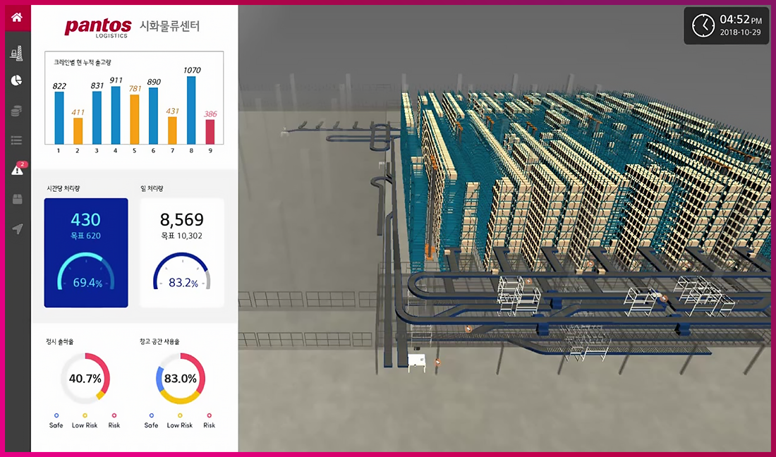 주문 이후 출하 생산성을 높이기 위해서는 최적 이송 경로 알고리즘을 적용해 무인운송로봇(AGV, Automated Guided Vehicle) 운영 및 배송 경로 최적화를 구현할 수 있습니다. 고객의 주문을 가장 효율적으로 피킹할 수 있는 AGV를 선정하고 작업을 할당합니다. 이어 AGV 별 최적 운행 경로를 결정하고 신속한 피킹을 수행합니다.