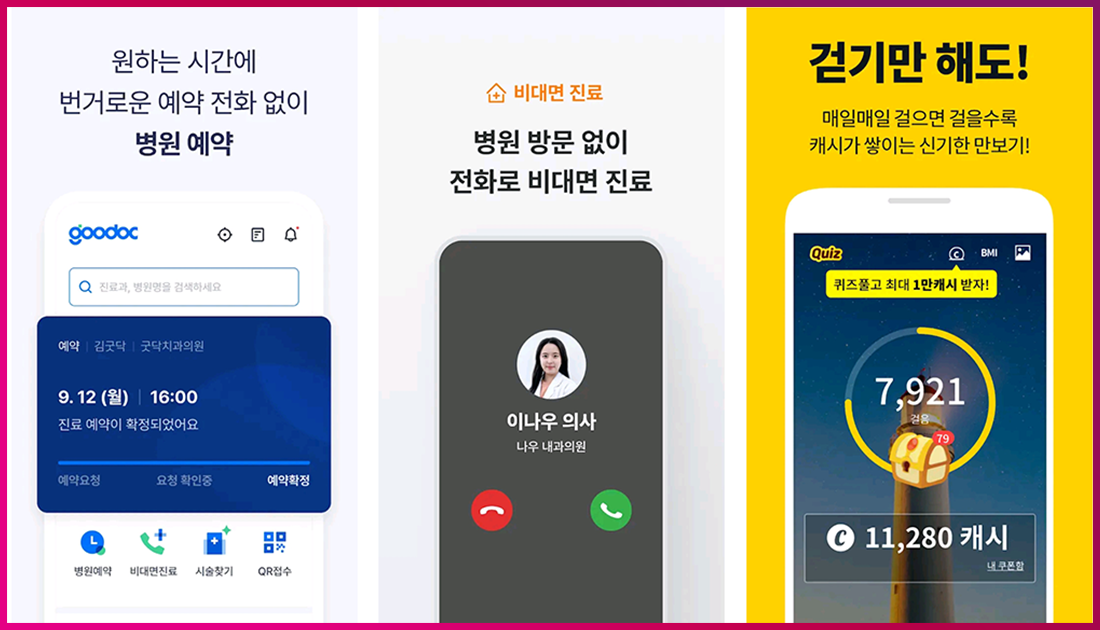 디지털 헬스케어 산업 분야에도 슈퍼앱으로 성장을 시도하는 업체들이 있습니다. 슈퍼앱이란 채팅, 금융, 쇼핑 등 다양한 서비스를 하나의 플랫폼에서 제공하는 앱을 뜻하는데요. 의료기관 검색 서비스에서 출발한 ‘굿닥’은 성형외과, 피부과, 안과 등 비급여 의료에 특화된 서비스를 제공해 누적 가입자 수 1,000만 명을 확보했습니다. 비대면 진료 서비스를 제공하던 ‘닥터나우’는 COVID-19 팬데믹을 겪으면서 900여 개의 의료기관과 제휴해 진료 및 약 배송 서비스로 범위를 넓혔으며, 현재는 진료 내역, 건강검진 결과 조회 등 개인 맞춤형 서비스를 확대하고 있습니다. 걸음 수에 대한 마일리지 보상 서비스로 유명한 ‘캐시워크’는 체중, 식단, 물 섭취량 등 개인 건강기록 관리 기능을 추가하고 건강기록을 앱에 등록하면 추가 포인트를 지급하는 등 개인화 서비스의 활성화를 시도하고 있습니다.