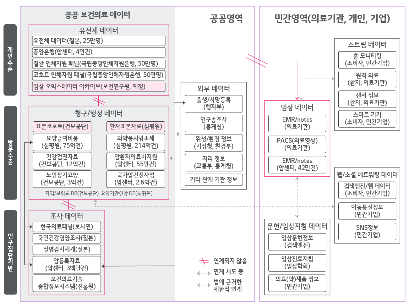 유의미한 개인화 헬스케어 서비스를 제공하기 위해서는 건강검진, 병원 진료, 식사·운동·수면·스트레스 등 일상생활에서 수집되는 라이프로그를 포함한 다양한 데이터를 활용해야 합니다. 하지만 법률 등 이유로 건강보험공단, 심사평가원, 병 의원 등 의료기관, 연구기관, 민간 서비스 업체의 보유 데이터는 공유나 통합이 어렵습니다. 그렇다 보니 소비자들이 주목할 만한 수준의 서비스가 나오기 힘든 환경입니다.