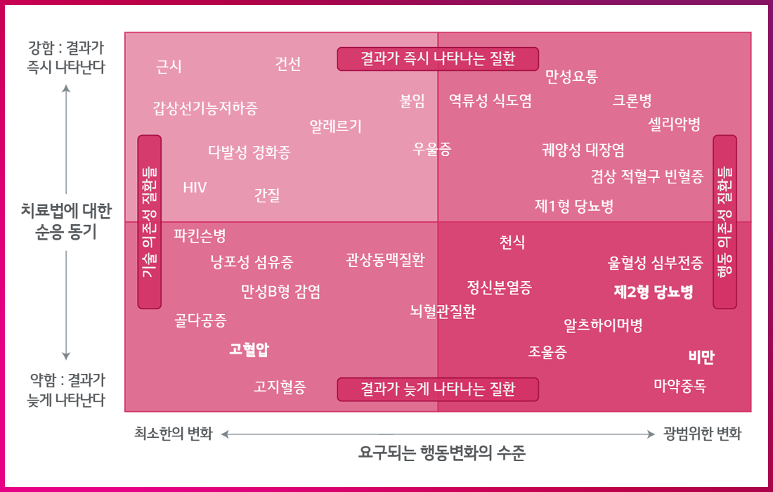 헬스케어 서비스는 질병의 종류 및 속성별(급성, 만성), 연령별(신생아, 영유아, 소아청소년, 청장년, 가임기, 폐경기, 노년, 임종), 성별, 직업별(사무직, 생산직, 교대직)로 니즈가 매우 다양합니다. 그렇다 보니 쇼핑, 계좌이체, 배달처럼 많은 사람들이 공통적으로 갖는 욕구와 제공해야 할 핵심 서비스를 선별하기가 어렵습니다. 만성질환만 해도 근시처럼 안경만 착용하면 바로 개선되는 경우가 있고 식사, 운동 등 모든 생활습관을 바꿔도 증상이 천천히 개선되는 비만과 같은 경우가 있어, 서비스 제공 방식도 다르게 접근해야 합니다.