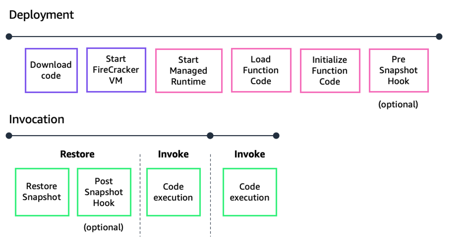 대신 Restore Snapshot 단계가 있고, 이 시간 동안에는 스냅샷을 로딩하여 초기의 상태로 빠르게 복원을 진행합니다.