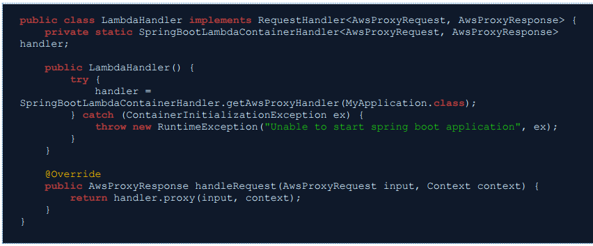 handleRequest는 Lambda의 이벤트를 처리하는 Method로 Lambda Function이 호출(invoke)되면 실행되는 영역입니다.