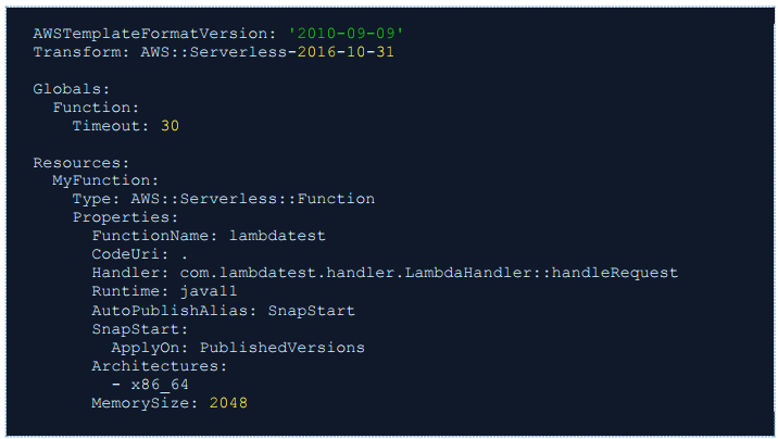 SnapStart.ApplyOn 항목에 PublishedVersions를 지정하고, AutoPublishAlias에 publish 한 후 사용할 이름을 지정합니다.