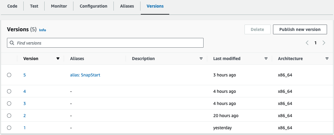 deploy를 여러 번 할 경우 아래의 이미지처럼 버전이 생성되고, 마지막 버전에 alias로 지정한 이름으로 보이게 됩니다. (alias: SnapStart)